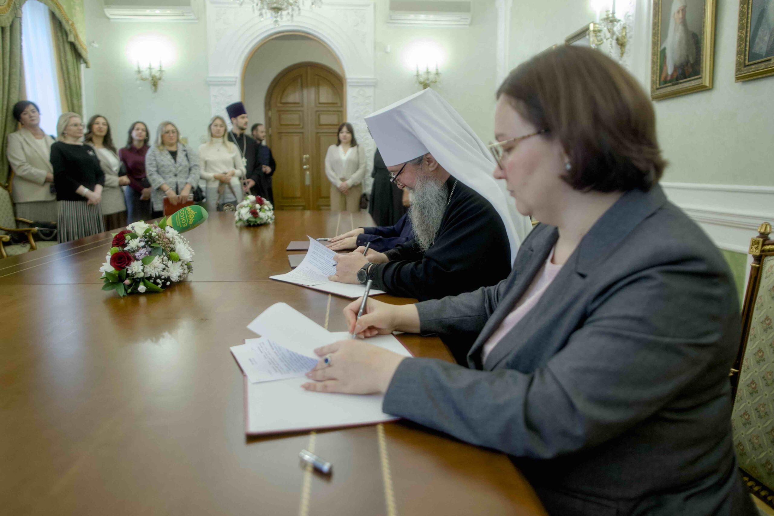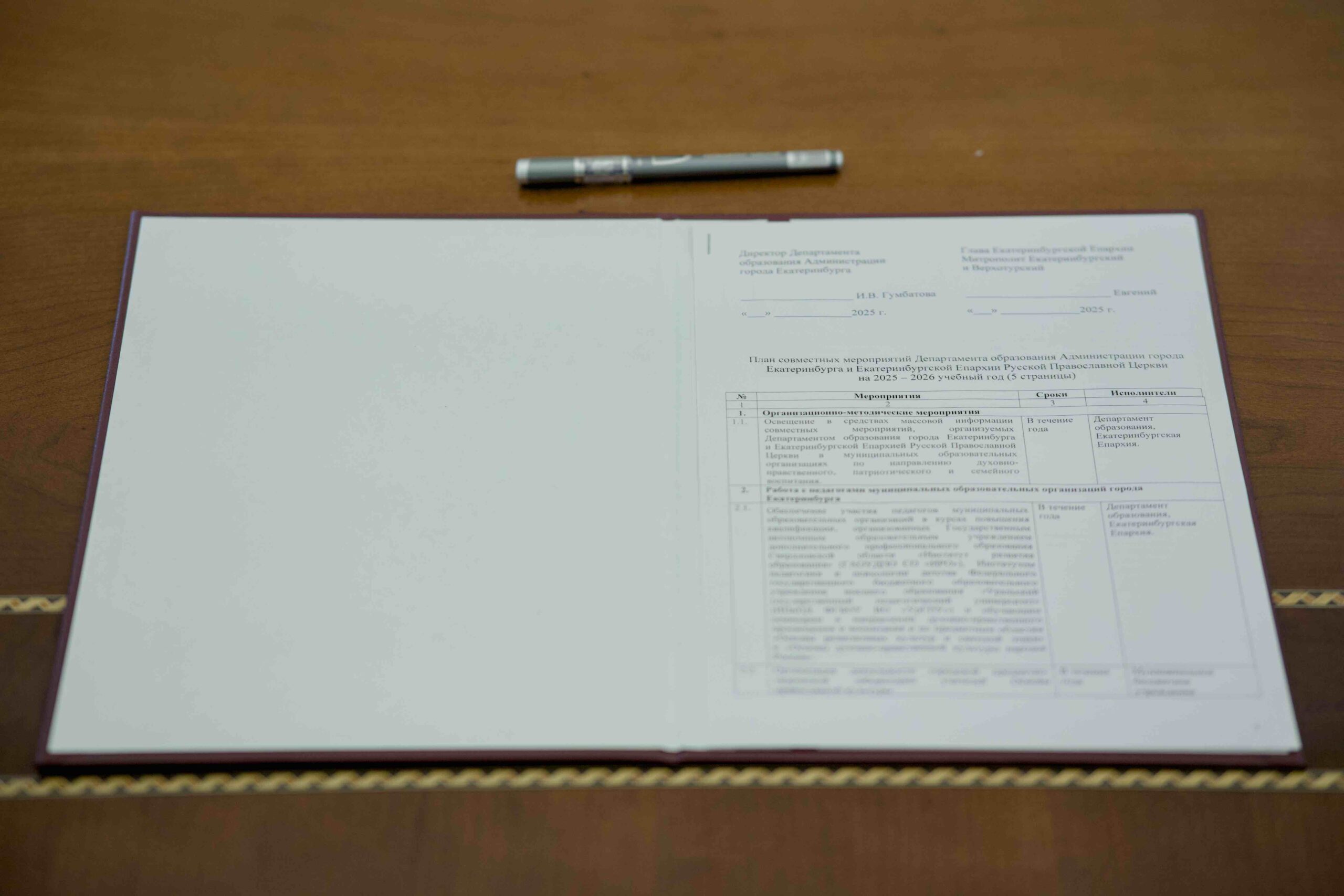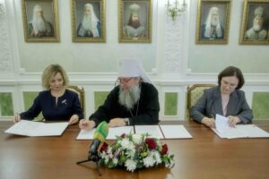 Сегодня, 10 октября 2025 года, председатель Синодального отдела религиозного образования и катехизации митрополит Екатеринбургский и Верхотурский Евгений, директор Департамента образования Администрации города Инна Владимировна Гумбатова и директор Екатеринбургского Дома Учителя Мария Андреевна Зорина подписали Соглашение о сотрудничестве в вопросах методического сопровождения педагогических работников в области духовного и нравственного воспитания на 2025-2026 учебный год.