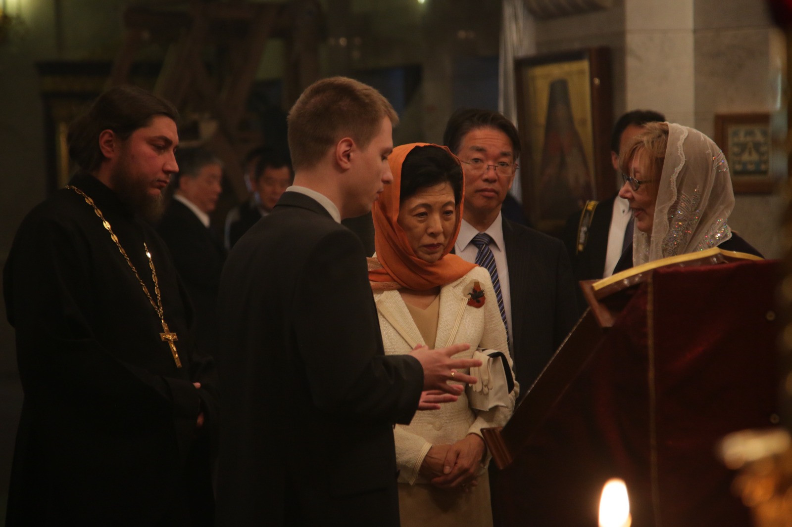 Осмотрев в музейной галерее Храма-на-Крови экспозиции выставки, посвященной Царственным страстотерпцам и их верным подданным, а также алапаевским мученикам — святым Елисавете Феодоровне и инокине Варваре, ее Высочество посетила верхний храм во имя Всех святых, в земле Российской просиявших. Здесь госпожа Такамадо, восхищенная убранством и оформлением собора, взялась за фотоаппарат, сделав снимки свода и фресок, на которых запечатлены сцены жития Царя-страстотерпца и его семьи.