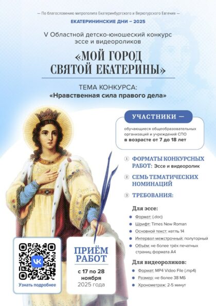 Напомним, организаторами V Областного детско-юношеского конкурса эссе и видеороликов «Мой город святой Екатерины» выступают Екатеринбургская епархия, Екатеринбургское отделение ВРНС при поддержке регионального Министерства образования и Департамента образования Администрации города Екатеринбурга, а также региональных СМИ и сообщества «Город святой Екатерины» в социальной сети «ВКонтакте».