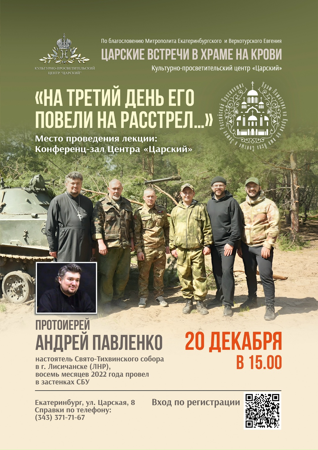 В культурно-просветительском центре «Царский» сегодня, 20 декабря 2025 года, в 15:00, в рамках «Царских встреч в Храме-на-Крови» состоится встреча со священником Андреем Павленко, побывавшем в плену.