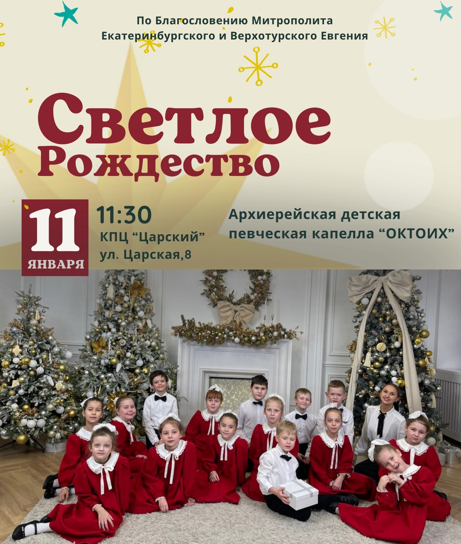 По благословению митрополита Екатеринбургского и Верхотурского Евгения Архиерейская детская певческая капелла «Октоих» дарит праздничный концерт, посвященный Рождеству Христову.