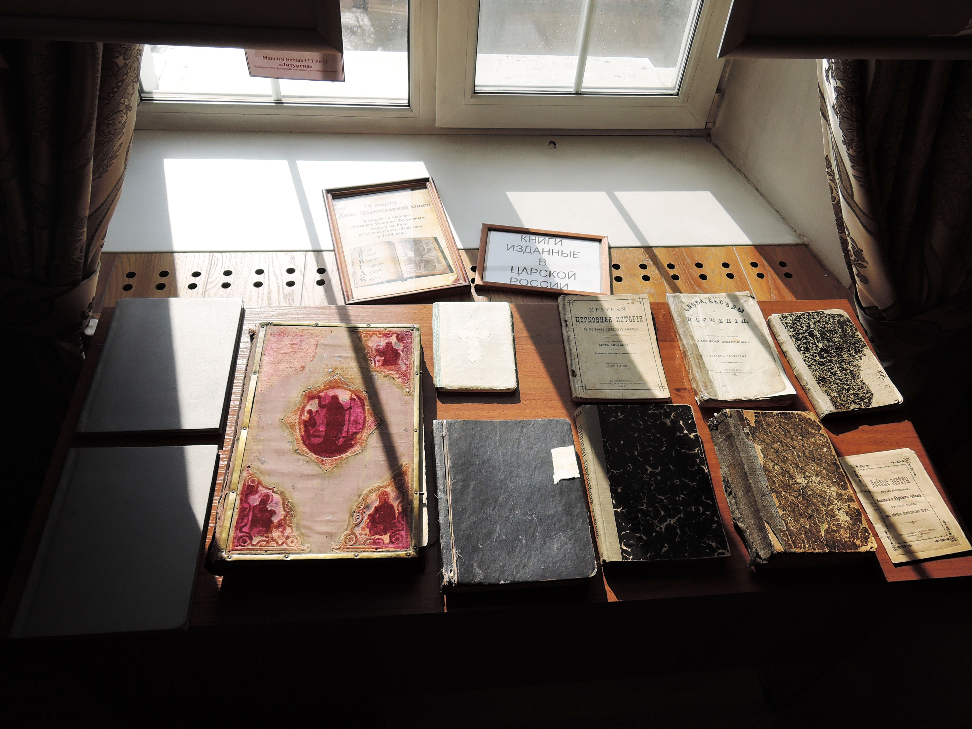 В Вознесенском Архиерейском подворье были представлены уцелевшие книги времен Царской России. И. о. руководителя культурных программ Екатеринбургской епархии Ольга Олеговна Орехина рассказала прихожанам о книгах, которые находятся в читальном зале библиотеки в честь святой Царской семьи храма Вознесения.