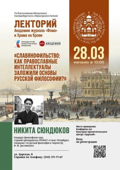 Лекцию на тему «Славянофильство: как православные интеллектуалы заложили основы русской философии?» проведет кандидат философских наук, старший преподаватель РАНХиГС в Санкт-Петербурге, специалист по русской философии и творчеству Ф.М. Достоевского Никита Кириллович Сюндюков.