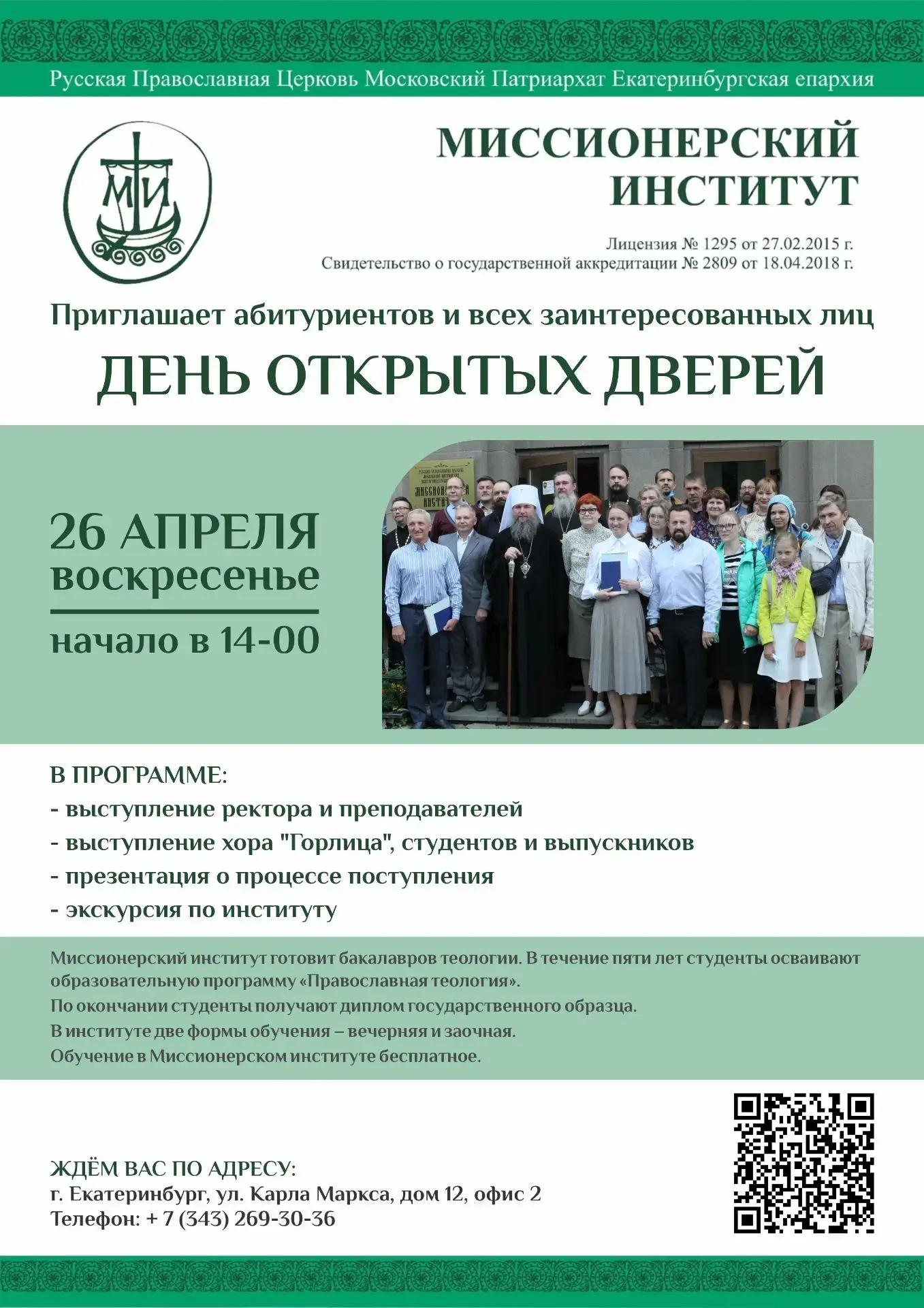 В Миссионерском институте Екатеринбургской епархии в воскресенье, 26 апреля 2026 года, состоится День открытых дверей. Начало в 14 часов (время местное).