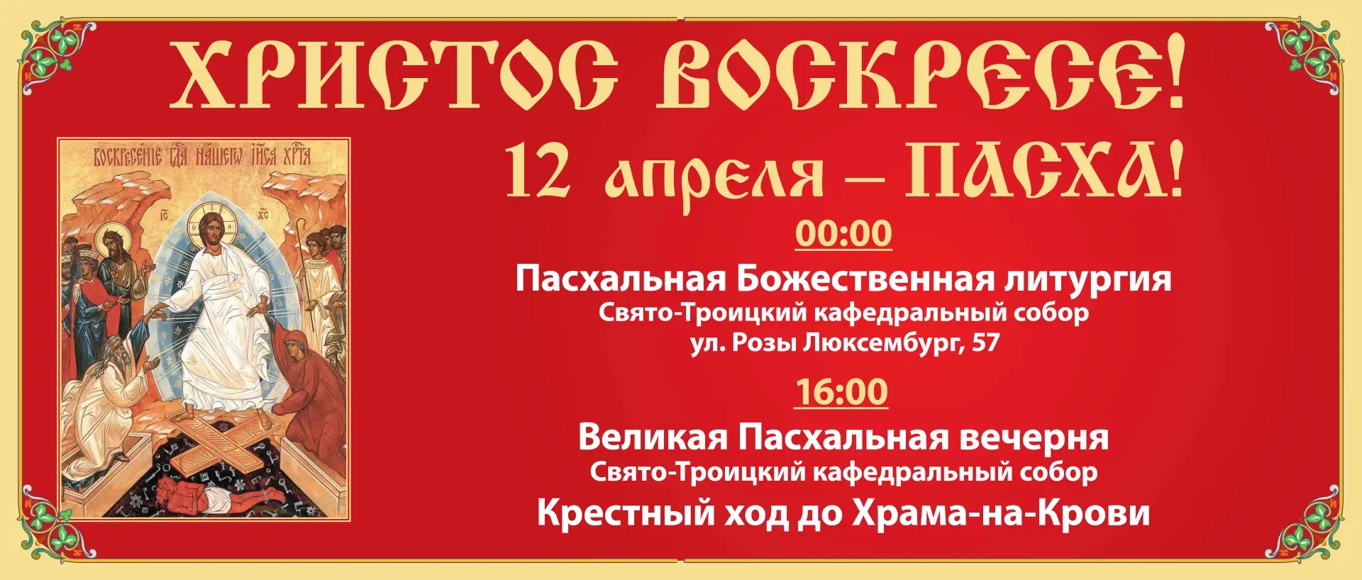 Старший Священник Храма-на-Крови протоиерей Максим Миняйло напомнил о том, воскресным днем 12 апреля в 16:00 в Свято-Троицком кафедральном соборе начнется Великая Пасхальная вечерня и состоится общегородской праздничный крестный ход, который пройдет от Свято-Троицкого собора до Храма-Памятника на Крови. Молитвенное шествие пройдет по улицам Екатеринбурга с Благодатным огнем, хоругвями и иконами. У Храма-Памятника на Крови, конечной точки крестного хода, продолжится Пасхальная вечерня. По завершении богослужения каждый участник молитвенного шествия получит в подарок куличик и сможет унести домой частичку Благодатного огня.