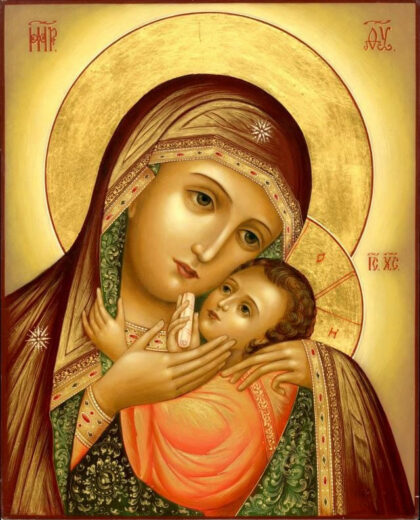 Велича́ем Тя,/ Пресвята́я Де́во,/ Богоизбра́нная Отрокови́це,/ и чтим о́браз Твой святы́й,/ и́мже то́чиши исцеле́ния// всем с ве́рою притека́ющим.